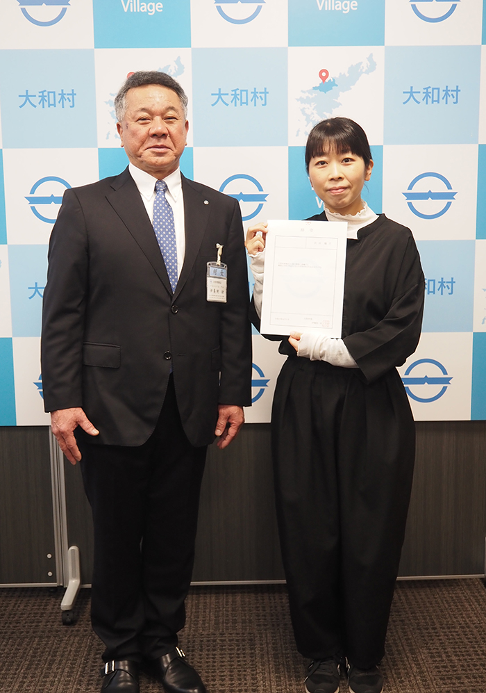 交付式で伊集院村長は「神奈川県大和市に住んでいた人に大和村に来ていただいて二重の喜び」と話し、「第三者が奄美の生き物を見た時に、別の角度から発信できるのではないか。今まで培ってきたものを発揮していただきたい」などと期待を込めた。