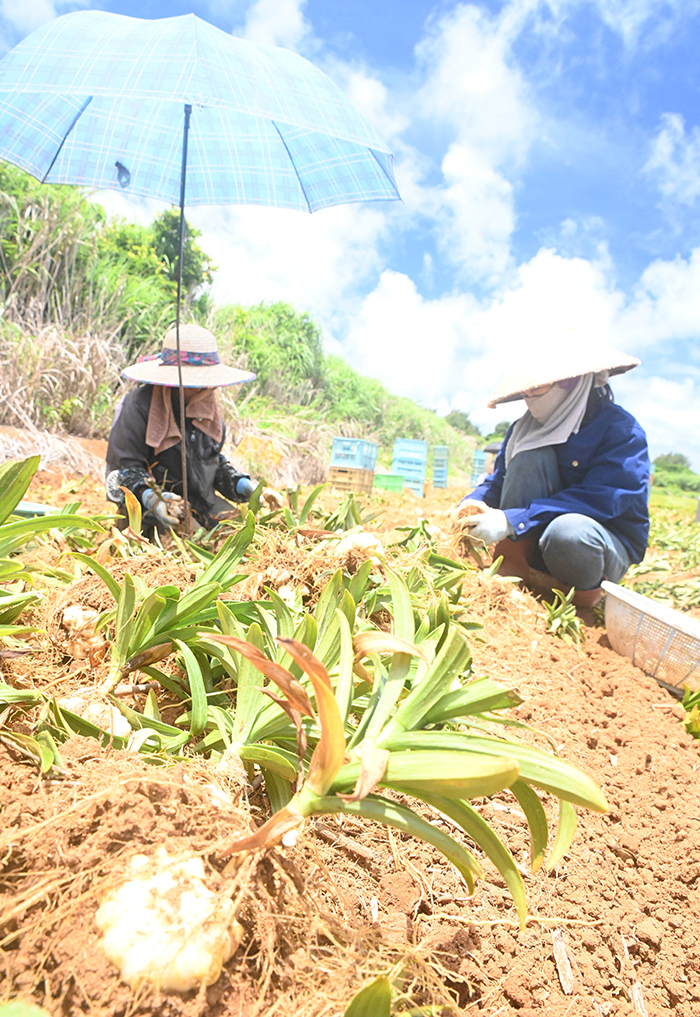 【沖永良部】沖永良部島の2025年産テッポウユリの球根取引が20日から始まった。奄美地方が梅雨明けし、島内では午前中から畑に入り、掘り取り作業に汗を流す農家の姿が見られた。今期の出荷ケース数は和泊町3000ケース、知名町2000ケース(前期実績両町合計5628ケース)を計画。取引期間は7月10日まで。