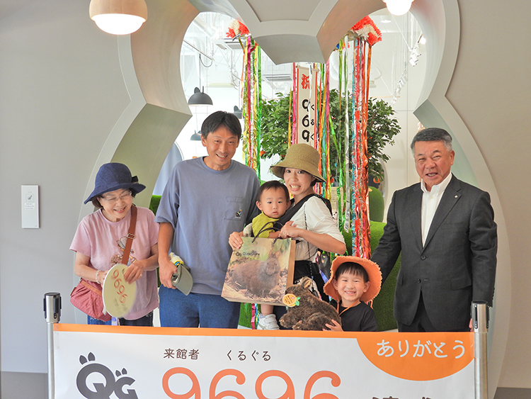 大和村思勝に4月20日オープンした「アマミノクロウサギミュ―ジアムQuruGuru(くるぐる)」の入館者が28日、9696(くるぐる)人に達した。館名にちなんだ9696人目は、鹿児島市から家族で旅行中の永田穣太郎君(4)。間近に見たクロウサギの姿に「おしりが丸くてかわいかった」と笑顔で話した。