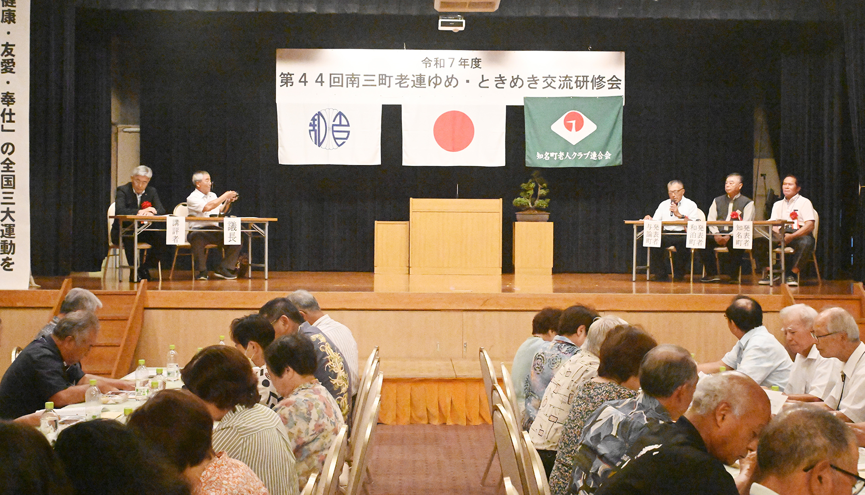 【沖永良部】2025年度第44回南3町老連ゆめ・ときめき交流研修会が29日、知名町フローラルホテルであった。知名、和泊、与論の3町老人クラブのメンバーら約160人が参加。各クラブの取り組みを発表し、活動のさらなる発展を誓った。