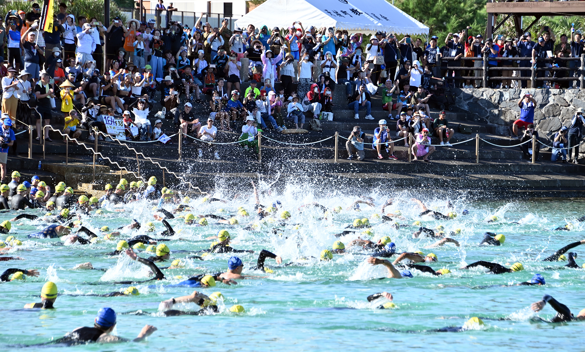 午前8時の号砲と共に選手たちは海に入り、スイムをスタート。波をかき分けて前へと2㌔のコース泳いだ。