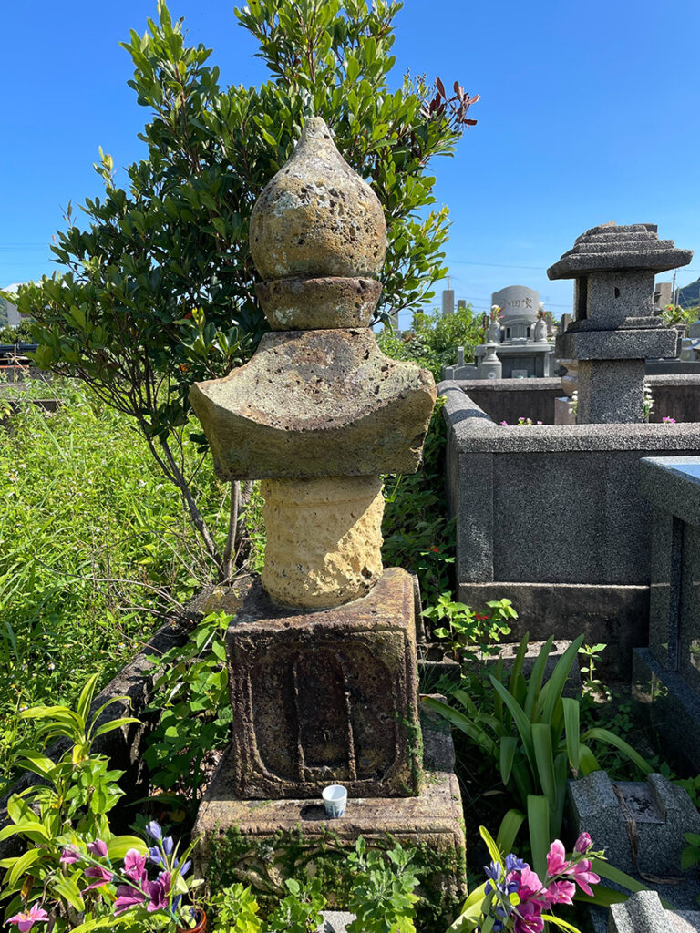 龍郷町幾里の龍宮(たつみや)家の墓地の一角にある「五輪塔」。水輪の部分は風雨による浸食で破損している(山田朋子さん提供)