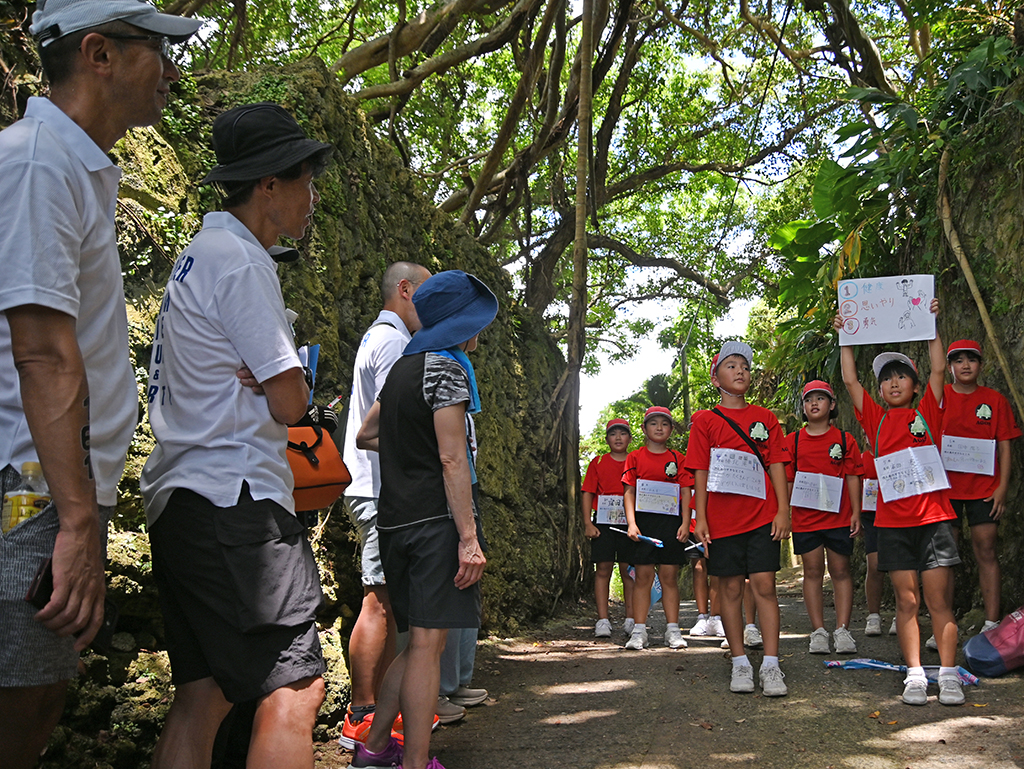 この日はトライアスロンに参加した選手16人とその家族や地域住民ら加えた合計29人を元気に出迎え、児童たちは樹齢300年のガジュマルやサンゴの石垣群、荘厳な渓谷や築90年以上の古民家で生活拠点として生まれ変わった旧家(前里屋敷)など、お薦めの7か所を紹介。道中では歴史やクイズも披露して集落の伝統や風習などを紹介した。