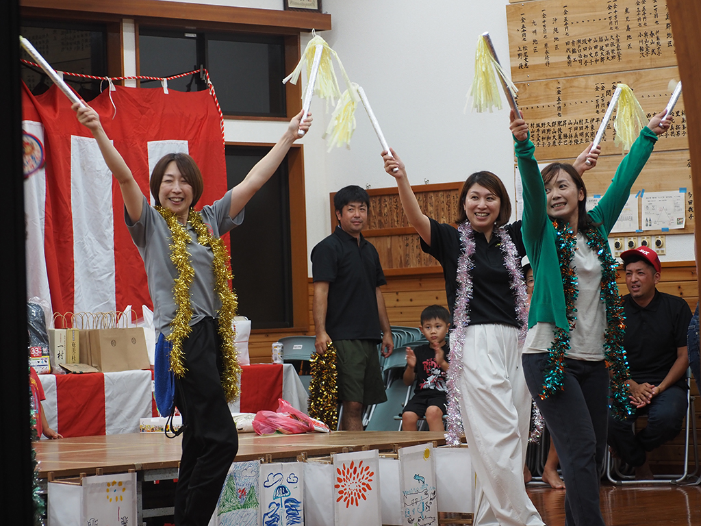 中金久集落の六月灯で、婦人会が「マツケンサンバ」などを踊り、祭りを盛り上げた