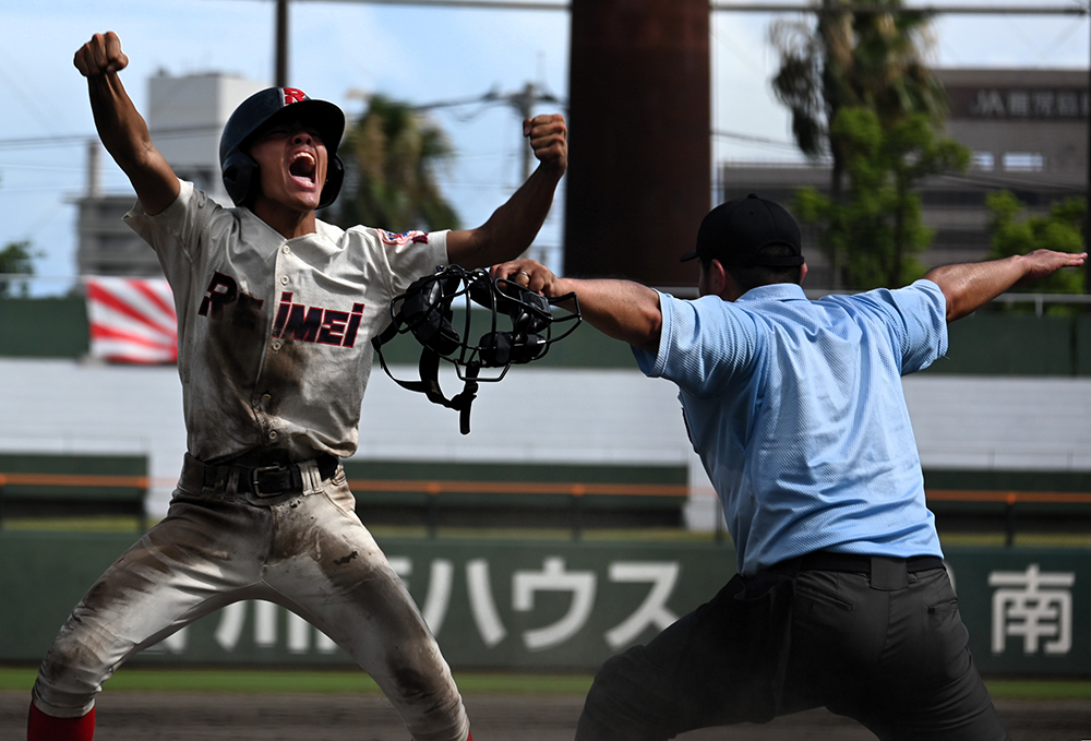 【準決勝・れいめい―鹿児島実】9回裏れいめい二死一二塁、一走・山口が生還、逆転サヨナラ勝ちを決める=平和リース