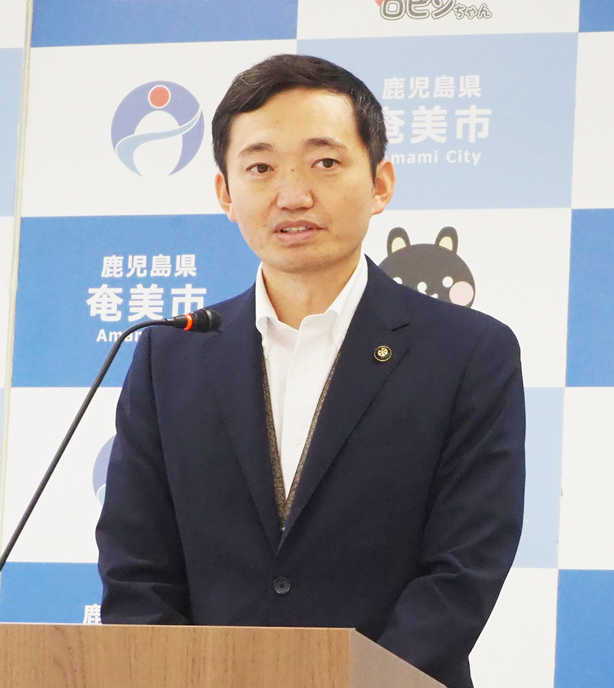 全9トピックス及び市長交際費公開について語る安田壮平市長(25日、奄美市役所)