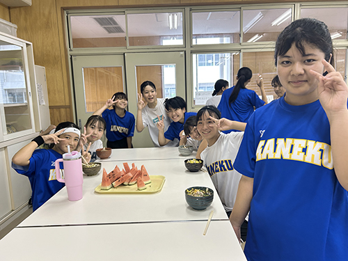 部活動を終えた金久中の生徒たちは次々と具材を入れてもらう列に並んだ後、鶏飯にスープを入れてもらってテーブルに着いた。デザートにはスイカもありうれしそうにほおばっていた。