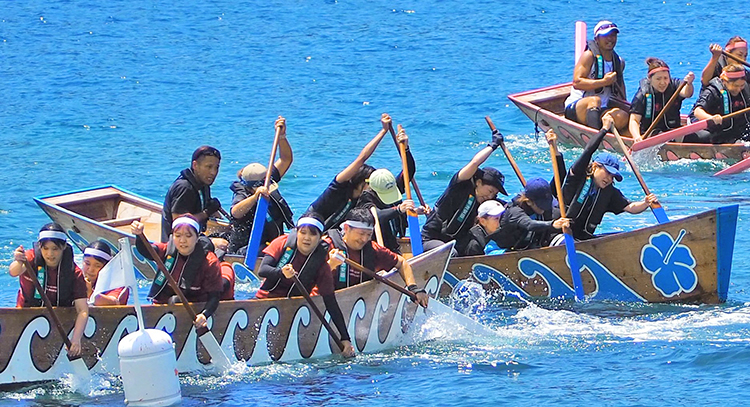 奄美市市制施行20周年記念「第62回奄美まつり」の舟こぎ競争大会が2日、同市名瀬港の佐大熊地区であった。2部門に計140チームがエントリー。真夏の青空の下、出場者らは掛け声とともに力を合わせてかいをこぎ、水しぶきを上げながら白熱のレースを展開した。一般の部は小湊舟勝負隊が初優勝、女子・子ども会の部は#清水集落が3連覇を果たした。今大会は、熱中症対策など出場者の健康面を考慮し、プログラムを短縮。昨年から導入したユーチューブのライブ配信も行われ、来場できない舟こぎファンに熱戦の模様を届けた。