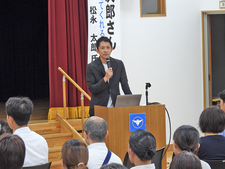 子どもの成長は「信じて待つことが大事」と話す松永太郎氏(1日、龍郷町りゅうがく館)