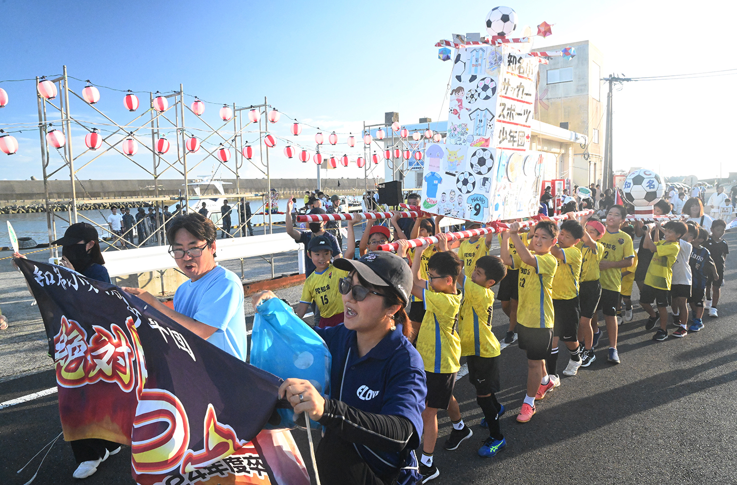 前夜祭パレードでおみこしを担ぐ子どもたち(2日、知名町)