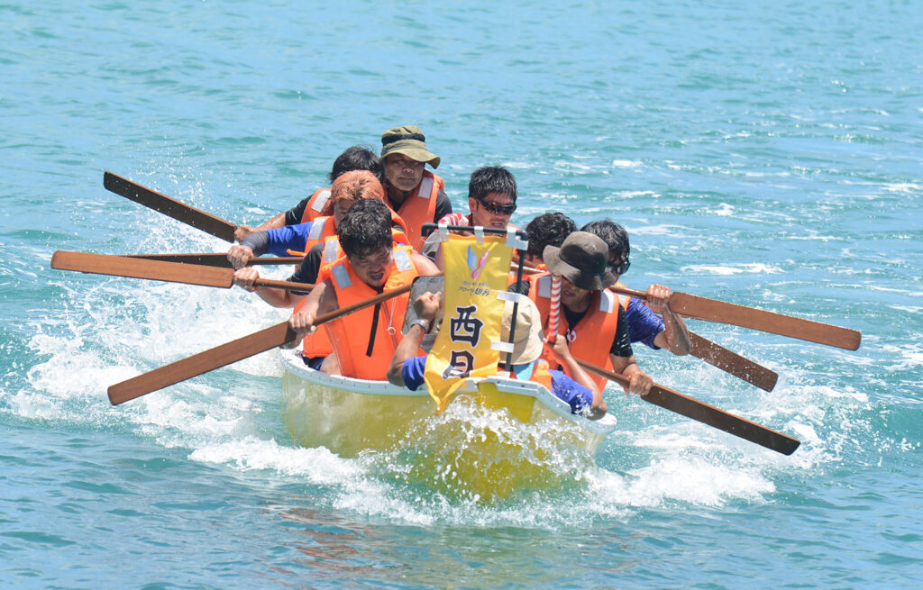 くり舟競争の決勝で力強くかいをこぐ西目Aチームの選手たち(3日、知名町白浜港)