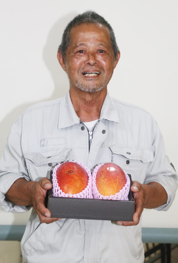 川島さんは品評会に出席。「前回は4年ぐらい前に出品したが、金賞受賞の発表にびっくりした」と驚いた様子を見せた。3連棟の鉄骨ハウス(面積8㌃)で栽培に取り組み、10年ぐらい続けているという。当初はカボチャ農家だったが、現在はマンゴーのほかドラゴンフル―ツなど果樹に切り替えている。「7月中旬から収穫に入り、今月15日頃まで続く。個販で出荷しているが、糖度の高さからだろうか口コミで年々注文が増えている」と川島さん。近くに製糖工場があり、「サトウキビの搾りカスであるバガスを土壌にまいており、これが他の農家の栽培と異なる部分。糖度の上昇につながっているかもしれない」と語った。