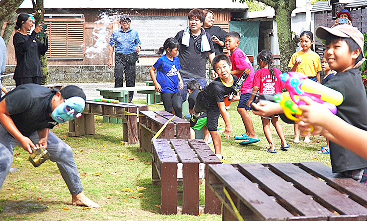 【徳之島】徳之島町亀津北区自治会(幸多勝弘区長)の第2回「みずかけ祭り」が9日、北区公民館広場であった。ちびっ子らと逃げ惑う大人たちが水鉄砲や水風船で水を掛け合い、会場は涼やかな黄色い歓声に包まれた。