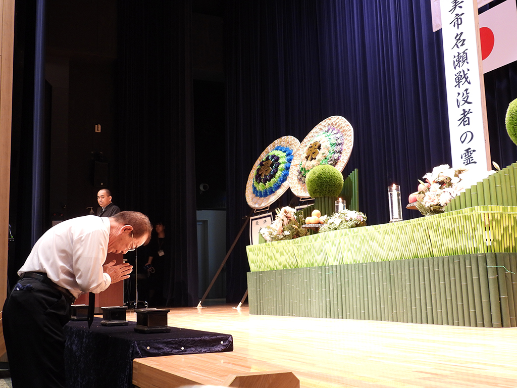 安田壮平奄美市長は「奄美市は、名瀬市街地の約90%が消失する悲惨な体験をした。記憶を風化させることなく、未来へ継承していくことが責務。恒久平和を願い、〝しあわせの島〟の実現に向け取り組む」と追悼の辞を述べ、不戦を誓った。
