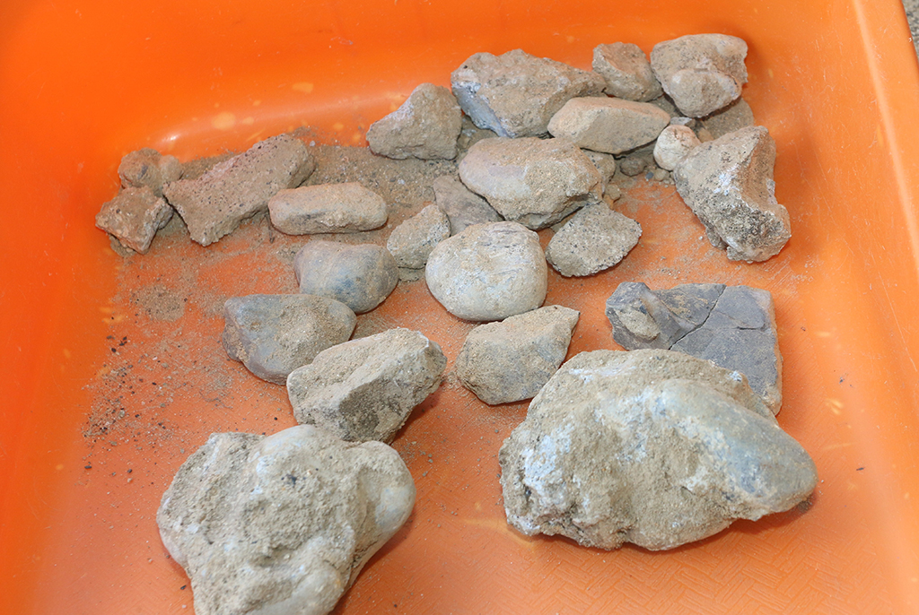 重機も使いながら表層を掘り下げた結果、1か所はナイター施設のケーブル(配線)、もう1か所はグラウンドの排水が反応したようだが、その間で試掘した箇所からは約40㌢の深さから当時の地表とみられる面と、コンクリートの基礎があったとみられる部分、さらに柱穴(ちゅうけつ)の可能性がある遺構を確認。コンクリートを含む玉石や瓦といった建物に付随するとみられる遺物が出土した。現在のグラウンドの下層には排水のためにアスファルトを砕いた黒い層があり、その下の粘土層を掘ったところから確認された。
