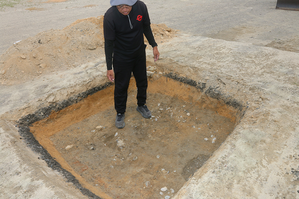 古仁屋高校での調査は生徒のグラウンド利用がない時期(今月12~15日)に着手。試掘調査前には位置情報が提供されるGPSを使って、司令部があった当時の写真と、現在の地図を重ねて司令部の建物があった場所を把握するとともに、地中レーダーで反応を探り、あらかじめ発掘する箇所を選定した。その結果、2㍍×2㍍の規模で3か所を試掘。調査を担当する鼎(かなえ)丈太郎主査は「今は古仁屋高校のグラウンドだが、当時、建物があった場所を狙って試掘した」と説明する。