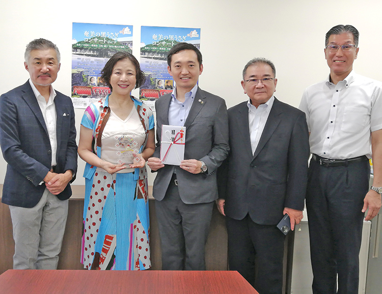 「奄美の黒うさぎコンサート実行委員会」と。左から川畑さん、萩原さん、安田市長、龍さん、池田忠徳広域事務局長