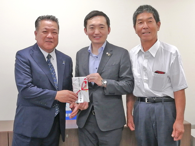 また、東京名瀬会からも同日寄付金を贈呈。同会からは中濱寛会長、高田秀輝幹事長が出席し安田市長へ手渡した。同会からは「ソテツのカイガラムシ被害を聞き、心を痛めている。緑化の推進に役立ててほしい」と要望があった。