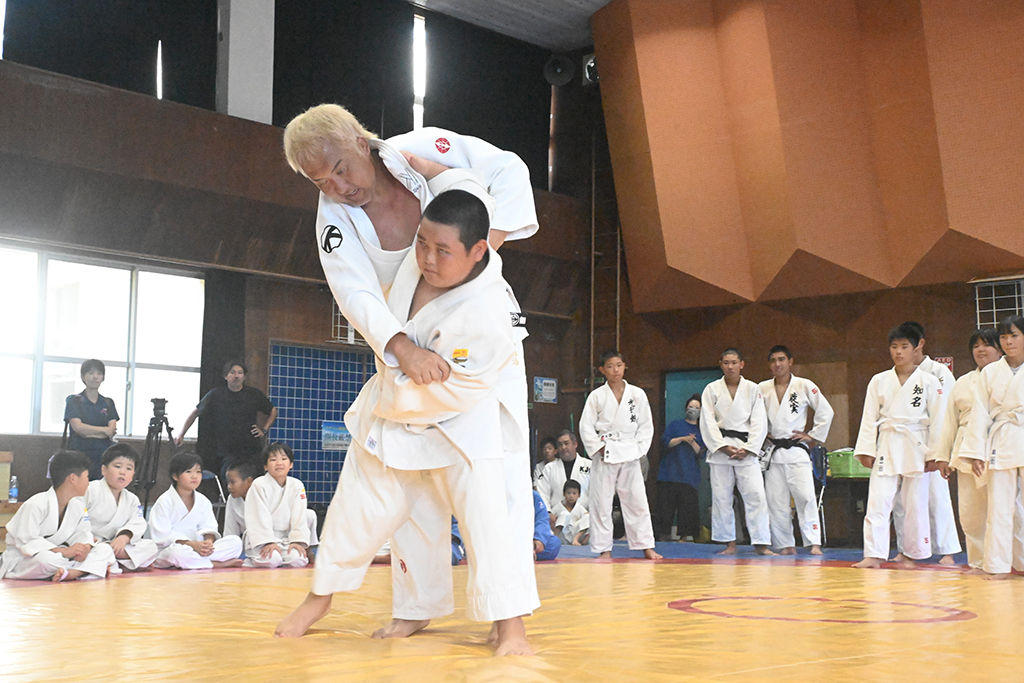 打ち込み練習では、「技をかける瞬間に相手の体を引っ張り、体を崩す。そうすることで技が掛けやすくなる」とアドバイス。その後、子どもたちの得意技を受けて技の切れを確かめたほか、足技や投げ技を実演して見せた。