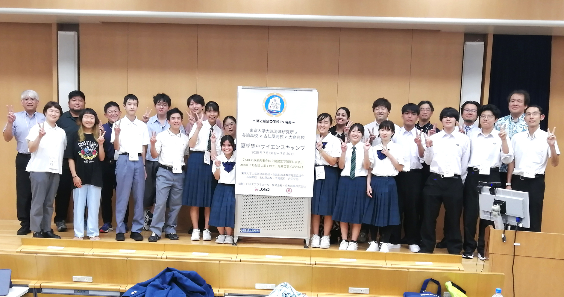 「海と希望の学校in奄美」とサブタイトルが付けられた同キャンプは、柏市の東京大学大気海洋研究所、与論町海洋教育推進協議会と3校による合同企画。同研究所を舞台に所内見学ツアー、講義、試料分析、研究発表の考察会など7月28~30日に行われた。