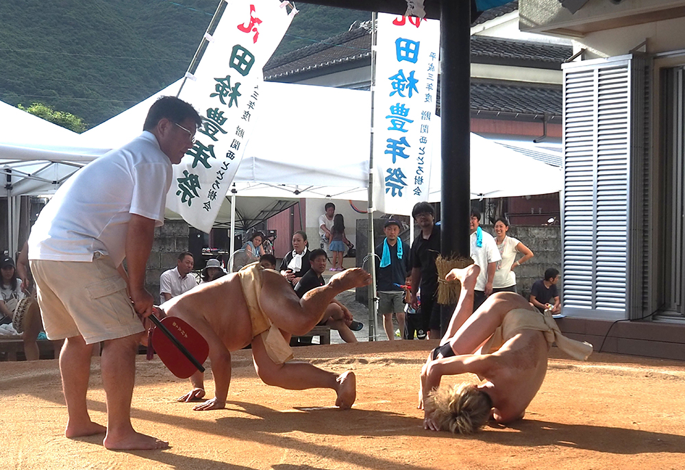 豊年祭で昨年から口上を務める峯宏治さん(左)と相撲行事を奉納する男衆たち