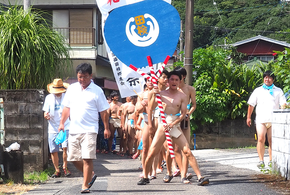 「ヨイヤ、ヨイヤ、ワイド、ワイド」の威勢の良い掛け声が集落一帯に響く中、まわし姿の男衆を先頭に、行列がミャー(土俵)へと前進。子どもや花笠に料理を乗せた女性たちが後に続き、一行はゆっくりと足を進め集落の小道を練り歩いた。