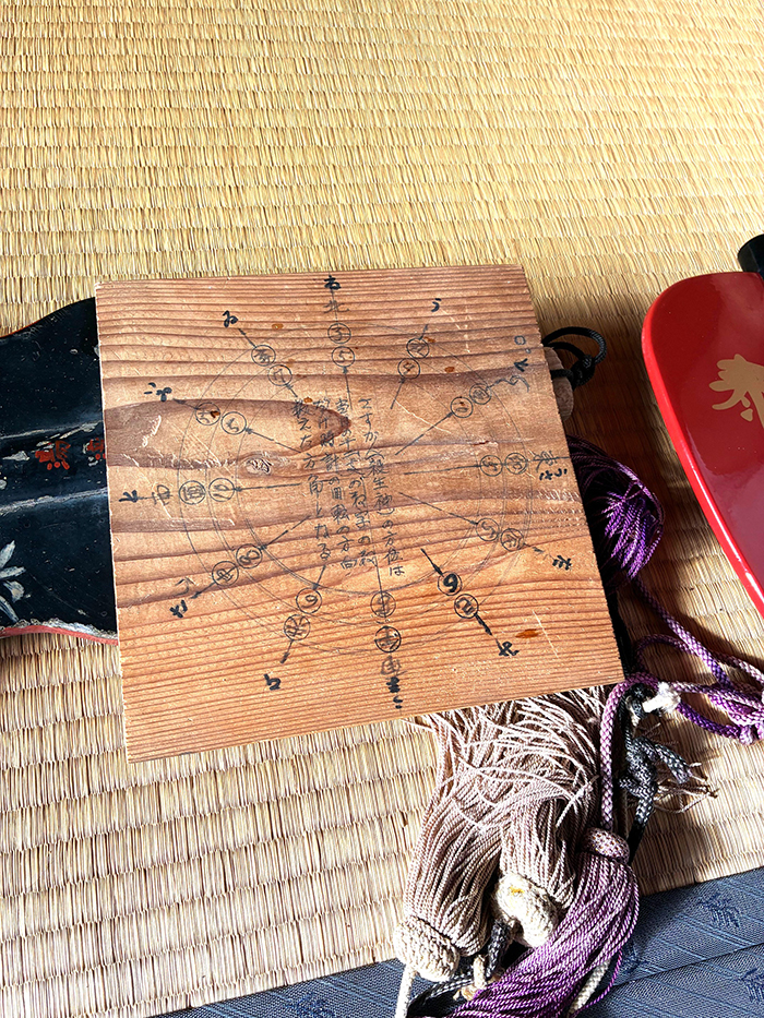 毎年の土俵への上がり口を十二支で示す「さすかん(殺生神)」と書かれた木製の方位盤。集落のトネヤに収められている