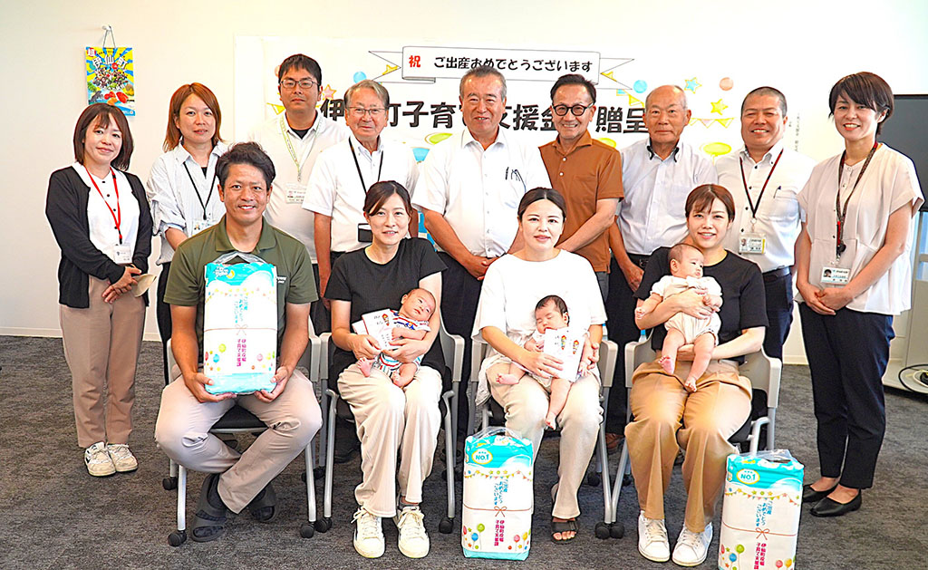 【徳之島】伊仙町の2025年度第1回「子育て支援金(出産祝い金)」贈呈式が27日、同町役場であった。上四半期対象となった6人の赤ちゃんのうち3人と家族が出席し、町から支援金や町商工会から商品券を受けるなど会場は笑顔に包まれた。