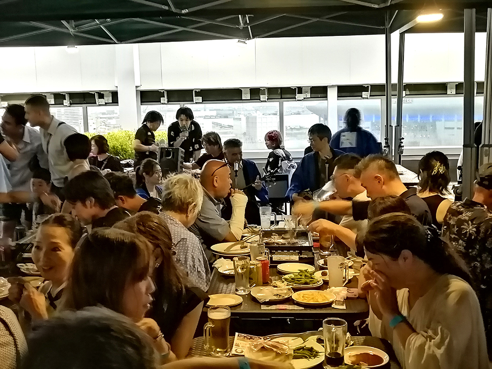 猛暑日だった10日は不安定な気象状況となり、時折滝のような雨が襲った。テントで覆われた広場では雨音を吹き飛ばすように、ポップスなどのほか徳之島出身の唄者・森田美咲さん、東京山ゆり会のシマ唄が披露された。24日も屋宮弘孝さん、中西りえさんの歌謡やシマ唄で大盛況となった。自慢の料理が並んだ各テーブルでは、飲み物(飲み放題)を持ち寄り、おいしい肉が焼ける音と匂いを楽しみながら近況報告。笑顔で島口を交わし、黒糖焼酎に酔いしれる姿が見られた。