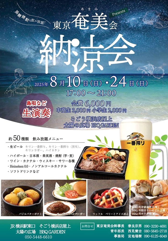 出身者や奄美ファンも参加し、東京奄美会が初めて主催した「納涼会」。横浜市西区のそごう横浜店屋上の「太陽の広場BBQ GARDEN」で8月10日と24日に開催されたもの。
