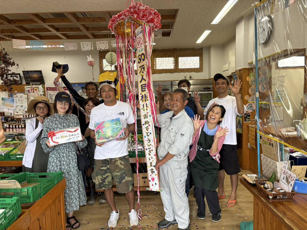 市場を管理する町農林課によると、30万人目となったのは同町古仁屋在住の定岡友之さん(44)。市場に地場産野菜などを出荷する生産者組合の川島博会長らがくす玉などで祝福し、市場から記念品(特産品詰め合わせ)などが贈呈された。同日正午過ぎに市場を訪れた定岡さんは、同島には観光とドライブで何度も足を運んでおり、「(30万人目は)正直うれしい。何も意識しておらず、まさか自分が…」と驚きながら喜んでいた。