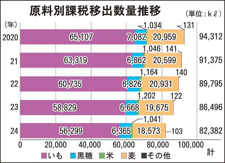 県酒造組合によると、焼酎麹用米の国産米の価格が高騰し、計画通りに確保することが難しかったことなどが原因で芋焼酎の生産量が前年比78・1%に落ち込んだ。黒糖焼酎の場合は麹に国産米高騰の影響は少なかったが、少子高齢化、ライフスタイルの変化、消費者嗜好(しこう)の多様化など、アルコール業界全体が慢性的に抱えている問題が主な要因と考えられている。