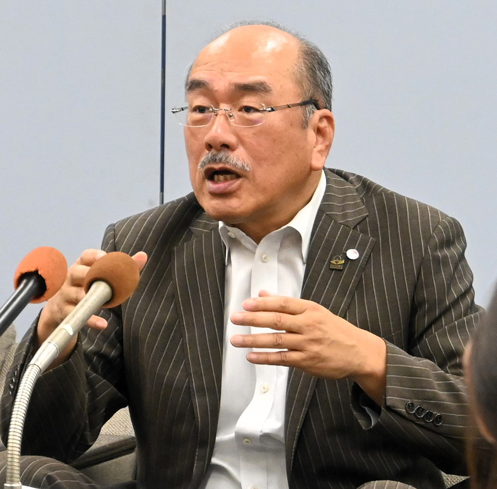 記者会見で需給状況を発表する県酒造組合の濵田雄一郎会長