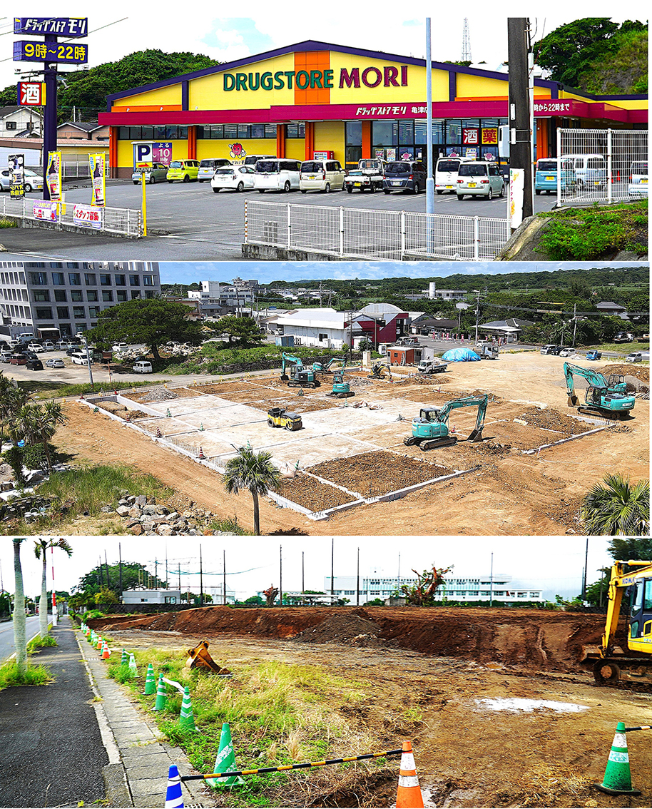 写真上からドラッグストア「徳之島亀津店」、来年初頭の開店が予想される同「伊仙町店」と「天城町店」の建設現場(今月3、4日)