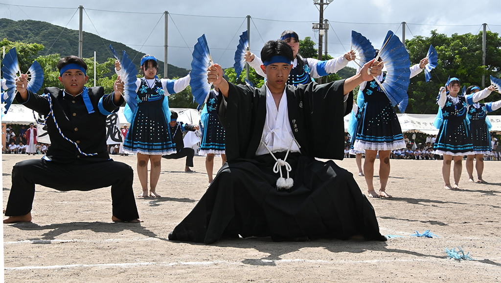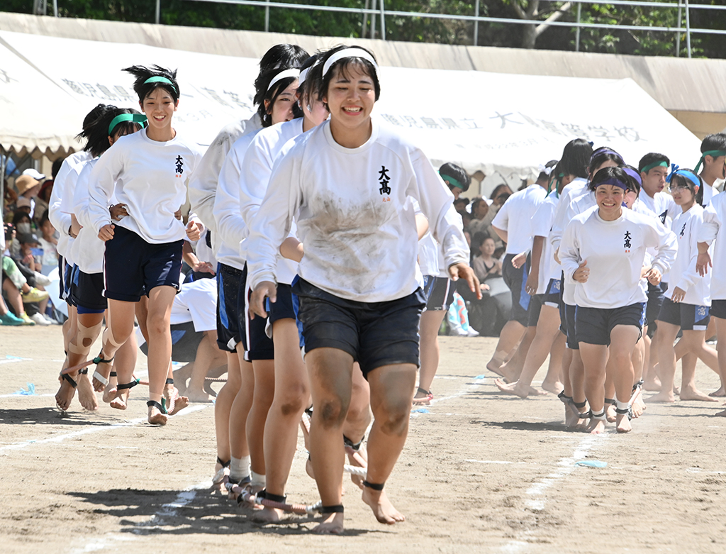 奄美市名瀬の大島高校(堂薗幸夫校長、生徒635人)では同校の上部グラウンドで第76回体育祭を実施した。生徒たちは出身中学校別の金久、伊津部(名瀬中、島外在住含む)、中南(大和村、宇検村、瀬戸内町出身)、笠龍(奄美市笠利町、龍郷町)、上方(朝日、芦花部)、下古(小宿、大川、崎原)の計6地区に分かれて同校の名物の応援団の演舞やむかで競争など全14種目で熱戦を展開。保護者や同窓会関係者らが見守る中、生徒たちは珍プレー、好プレーで暑さを吹き飛ばした。