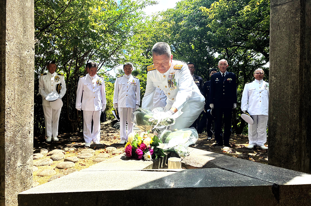 慰霊碑「くれないの塔」で献花する海上自衛隊員ら(7日、奄美市名瀬のらんかん山)