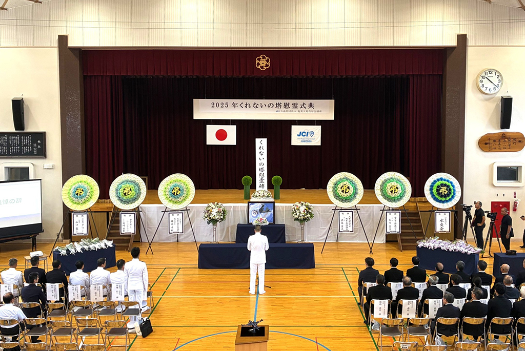 式典は名瀬小学校体育館であり、自衛隊員、地元関係者や住民ら約50人が参列。P―1哨戒機による名瀬上空での慰霊飛行後に営まれた。式典後には、らんかん山に建立された慰霊碑「くれないの塔」へJC会員や自衛隊員ら有志が移動。鎮魂の思いを込め、祈りをささげた。