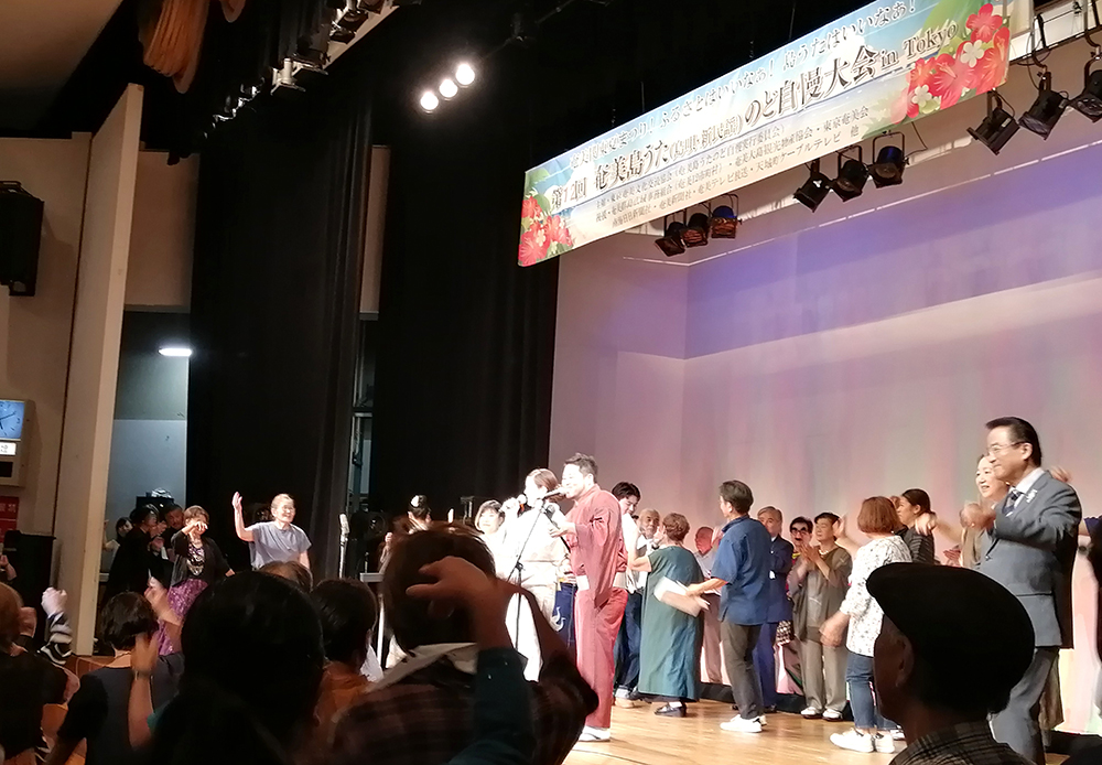 関東をはじめ、熊本県、京都府、新潟県、さらにはドイツ出身者ら全出演者にエールを送るよう第3部では、多彩なゲストがステージを飾った。「琉球舞踊・伊是名の会」が華麗な演出で奄美の世界を表現。歌手・屋宮弘孝さんは「島なさけ」などのほか、新曲「手鞠(てまり)の詩(うた)」(所ジョージ作詞・作曲)を熱唱。久永さとみさんは、伸びやかな声でおなじみの「スラヨイ黒糖」などを披露した。里歩寿、里朋樹の唄者姉弟は息の合ったステージで、「まんこい節」などを歌い上げ、大きな拍手に包まれた。惠原義之審査委員長は「出場者の師匠や教室が多彩で、個性があった。歌う技法も違い、来場者は楽しめたと思う。若い歌い手には学ぶところが大きい」と講評した。興奮と感激の表彰の後は、六調でフィナーレとなった。