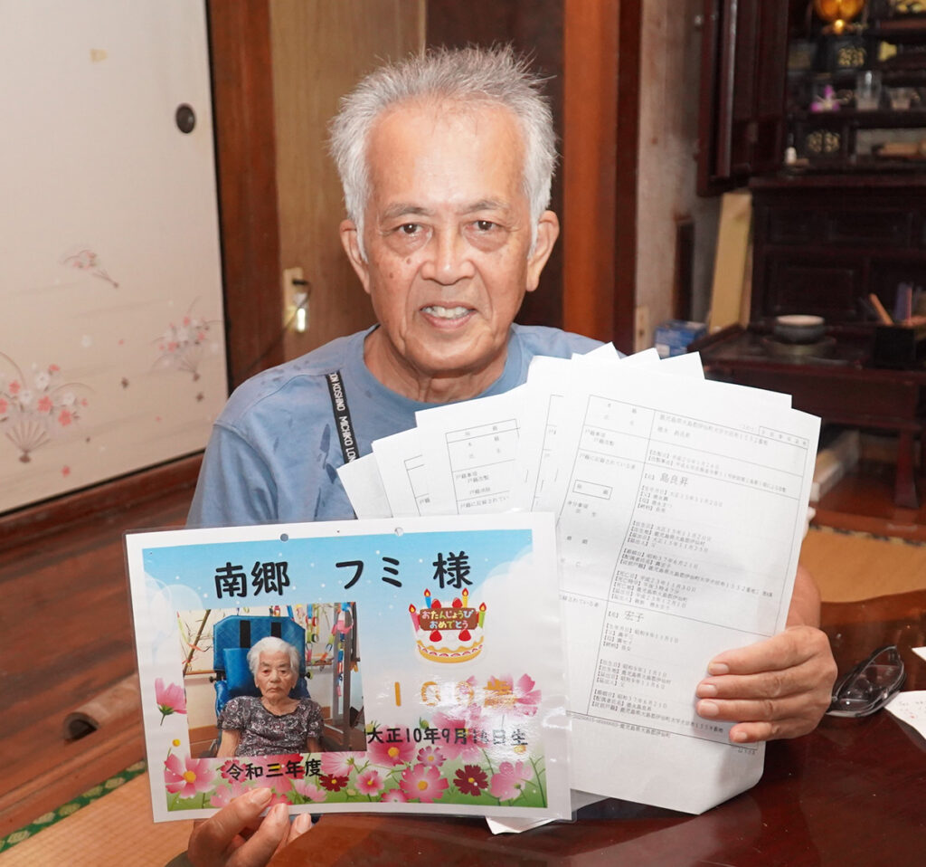戸籍謄本を基に合計寿命「507歳209日」を明らかにした南郷秀一さん=13日、伊仙町