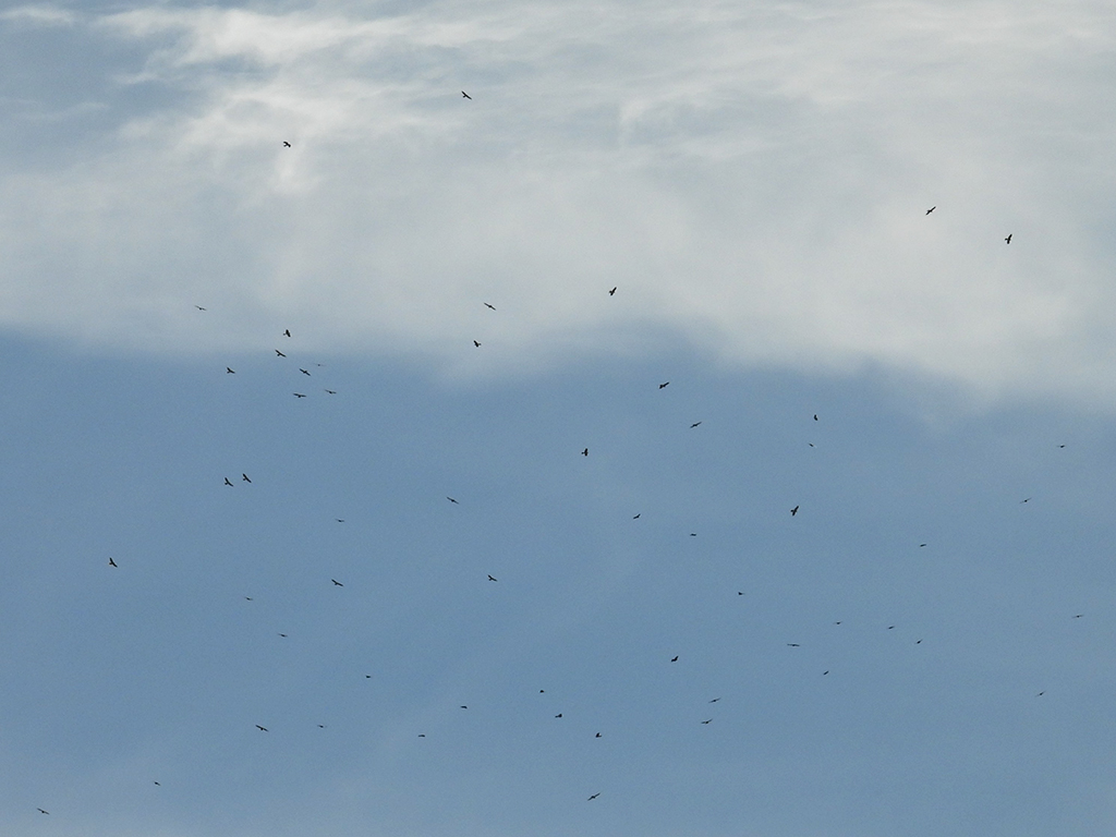 単体で現れたタカはやがて合流し、20~80羽で何度も鷹ボールを形成した。上昇気流に乗るために羽ばたく姿が肉眼でも見て取れた。