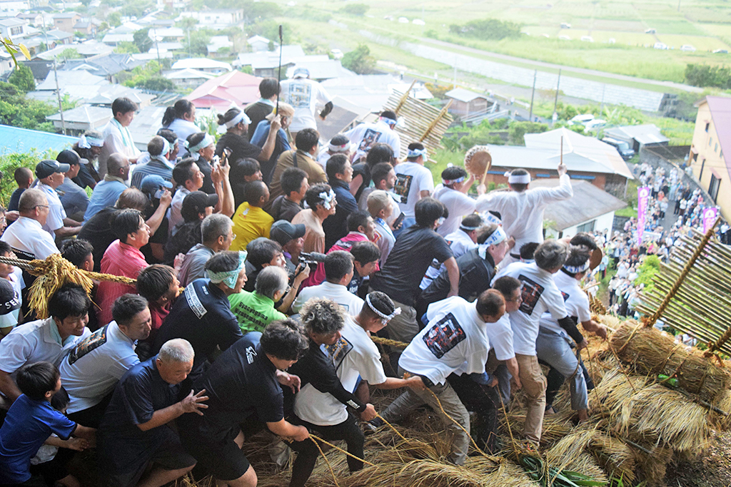 旧暦8月の初丙(ひのえ)にあたる24日、龍郷町秋名・幾里地区に伝わるアラセツ(新節)行事の「ショチョガマ」「平瀬マンカイ」が同地区であった。集落には大勢の住民や観光客らが詰め掛け、国の重要無形民俗文化財に指定される荘厳な伝統行事を見守った。