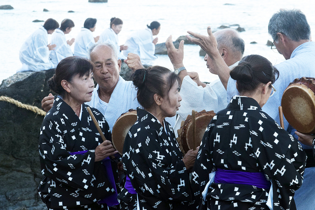 しめ縄を張った神平瀬には、ノロ役の白装束の女性5人が登り、女童(メラべ)平瀬には、グージら男性3人と女性4人が上がって唄掛け。神事の後は、「スス玉踊り」などの八月踊りが浜辺で始まるなど、詰め掛けた観衆らが手拍子を打って楽しんでいた。