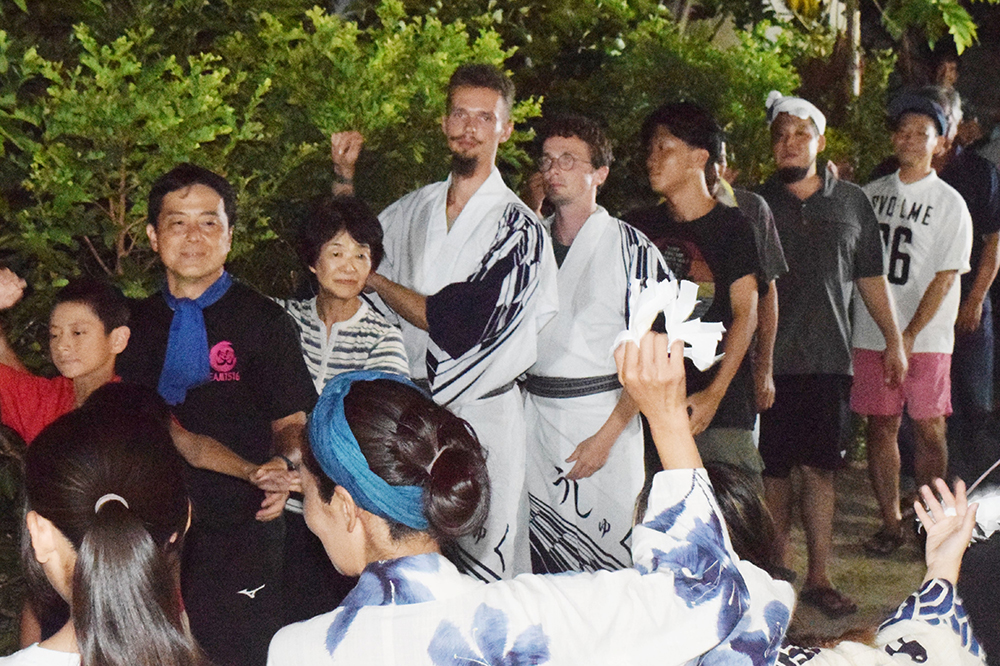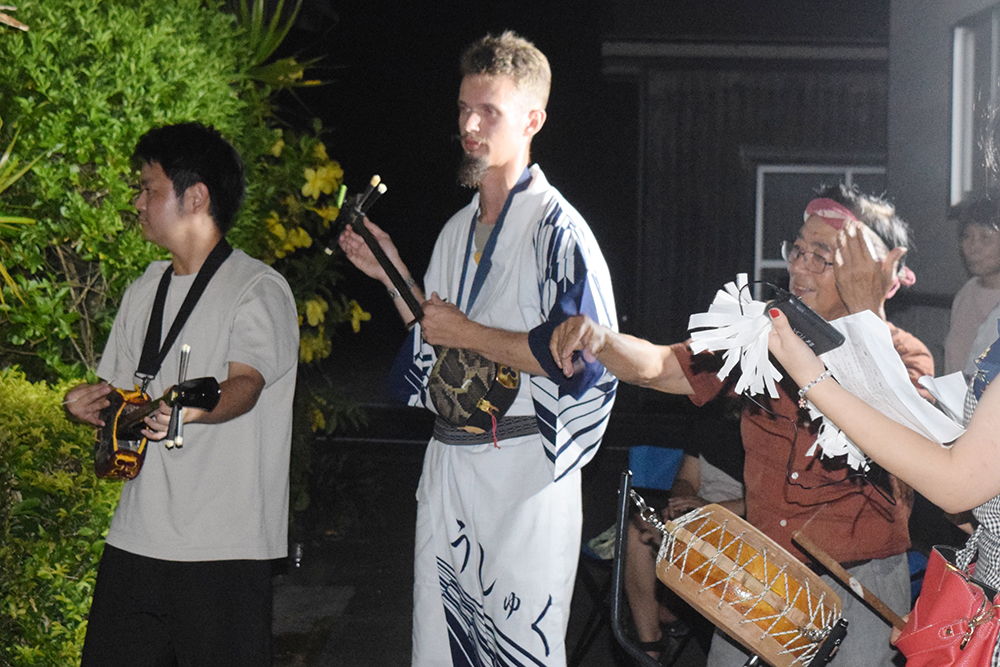 奄美市笠利町宇宿集落(濵崎哲孝区長、112世帯)の恒例行事「宇宿八月踊り」で25日、ドイツ人旅行者のコンラド・マツスさん(24)が祭りのトリを飾る「六調」で三線(サンシン)演奏を披露した。異国とのコラボレーションに、集落住民らは歓喜の踊りで歓迎。コンラドさんは「少し緊張したけど、楽しかった」と笑顔で話していた。