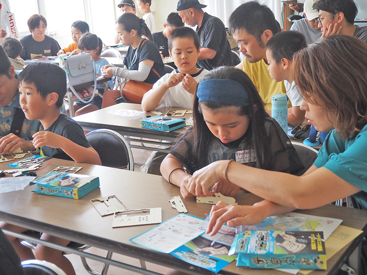 講座後は参加していた子どもたちがソーラーカー(木製)の手作りに挑戦。保護者らに手伝ってもらいながら完成した車に投光器を当てての競争もあり、子どもたちからは歓声があがった。
