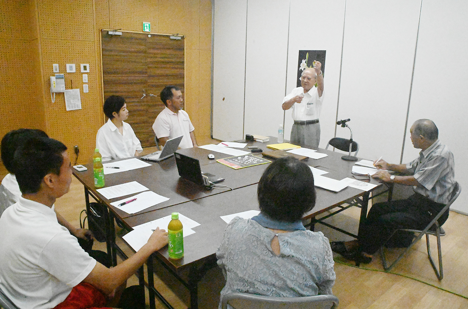 【沖永良部】戦後80年に合わせ、和泊町の戦争の記憶を継承するプロジェクト「和泊の戦中・戦後アーカイブプロジェクト」のプレイベントが28日、同町役場結いホールであった。地元住民7人が参加し、戦争体験者2人の証言に耳を傾けた。