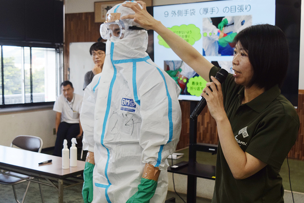 本物の防護服を使って着脱を説明する県鹿児島中央家畜保健衛生所大島支所の職員たち