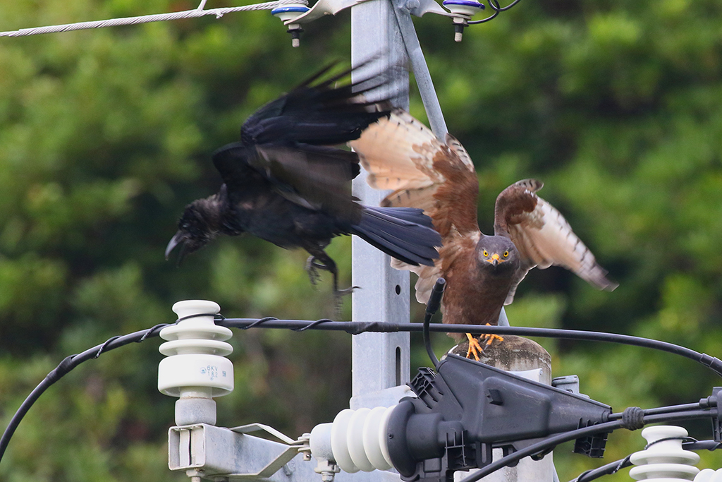 電柱の上でカラスを威嚇する暗色タイプのサシバ(3日、奄美市名瀬知名瀬)=与名正三さん撮影=