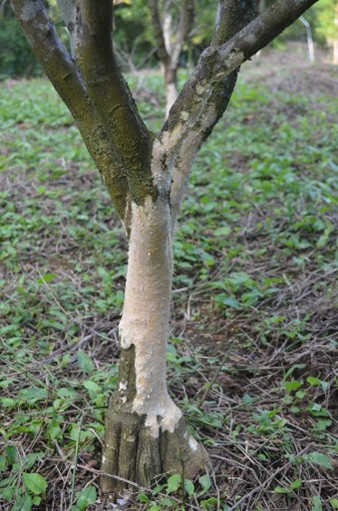 アマミノクロウサギによるタンカン樹木の食害を示すかじり跡(大和村の果樹園)