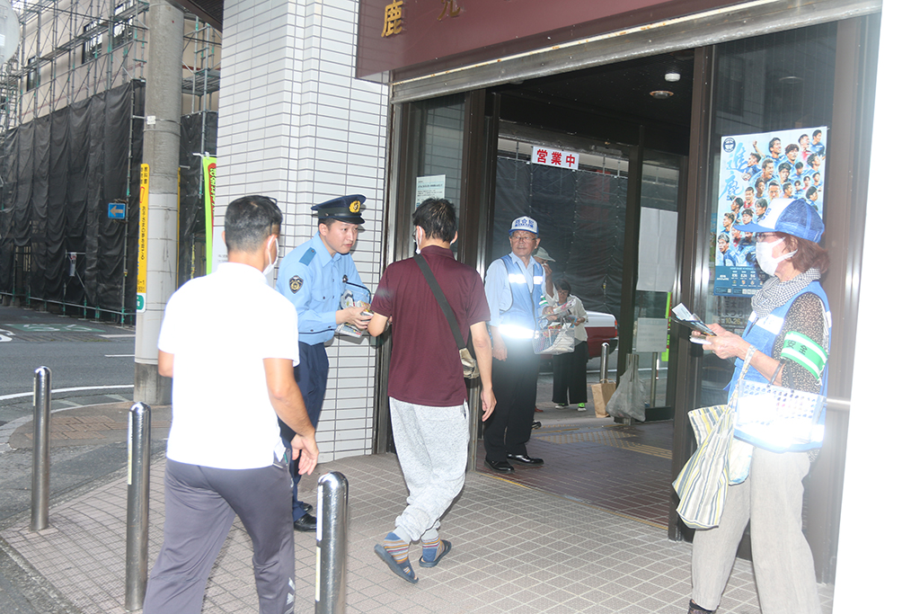 鹿銀大島支店前では入り口の2か所に「うそ電話詐欺注意~お金はすぐに振り込まない 誰かに相談~」と記された黄色ののぼりを設置。午前9時半から30分ほどかけて、ATM(現金自動預け払い機)利用で次々と訪れる来店者や通行人に「詐欺被害防止」「犯罪のない安全で安心なまちづくり旬間」「闇バイトは犯罪」を伝えるチラシなどを配った。警察署員から受け取って「掛かってくる電話には注意しているよ」と語る高齢者もいた。