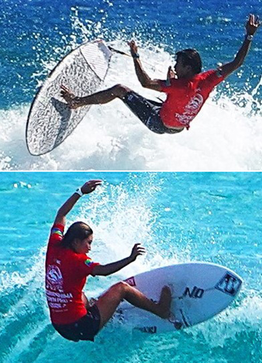 女子の部では、ローカル出場の山田佳那(16)=奄美市笠利町=と青山湖音(18)=徳之島町母間=両選手がそろって第3位入賞を果たし大健闘。地元のヤングサーファーら応援団を喜ばせた。
